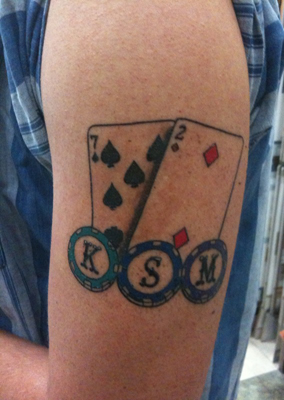 I thought you’d all enjoy the latest tattoo from my home game. That’s William’s arm sporting a brand new hammer. He didn’t name names (Torres), but it was apparently in honor of the “any two” strategy successfully employed by some of our members.