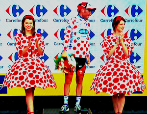 I realize a lot of sports have a bimbo marketing factor. At the base end of the spectrum, you have the gals strutting it between boxing rounds. Even the Tour de France features stunning models for the jersey presentations. But are they featured in bikinis or lingerie? Nope. They get to wear the coolest stuff — like these polka dotted dresses. (I’m not much of a dress gal. It’s either a suit or jeans for me. But I am mad for those dresses. I totally want one.)